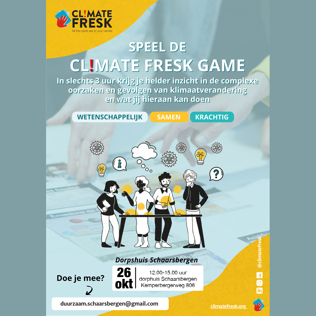 Klimaatverandering is best complex. Wil je beter begrijpen wat de oorzaken en gevolgen zijn van klimaatverandering? Dan zou je de wetenschappelijke IPCC-rapporten kunnen bestuderen. Maar dat is stevige kost. Een leukere én snellere manier om deze kennis op te doen is door middel van het klimaatspel Climate Fresk. Met een aantal buren of vrienden leer je op een creatieve manier over klimaatverandering en ga je met elkaar in gesprek over mogelijke oplossingen en acties om het tij te keren.